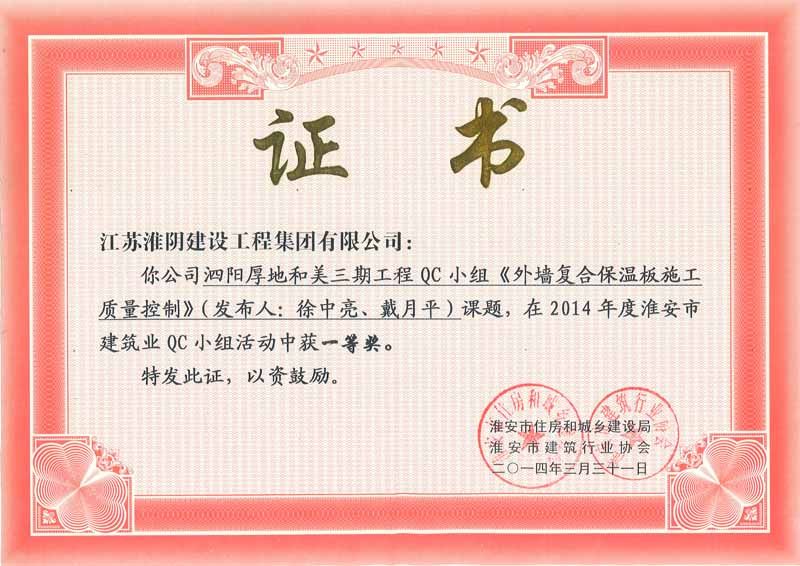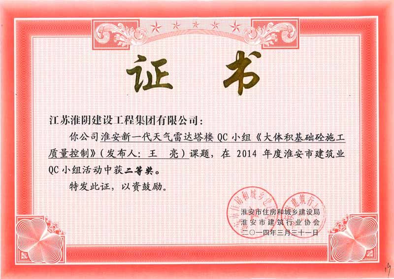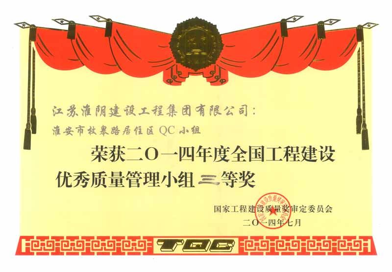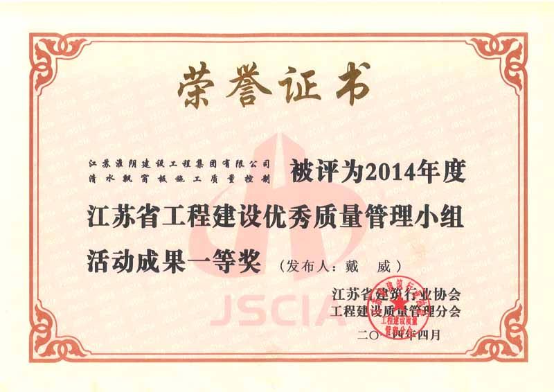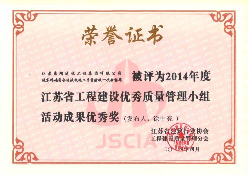 2014年度全国工程建设优秀质量管理小组三等奖淮安市枚皋