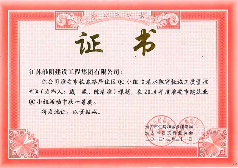 2014年度QC一等奖淮安市枚皋路居住区《清水飘窗板施工质
